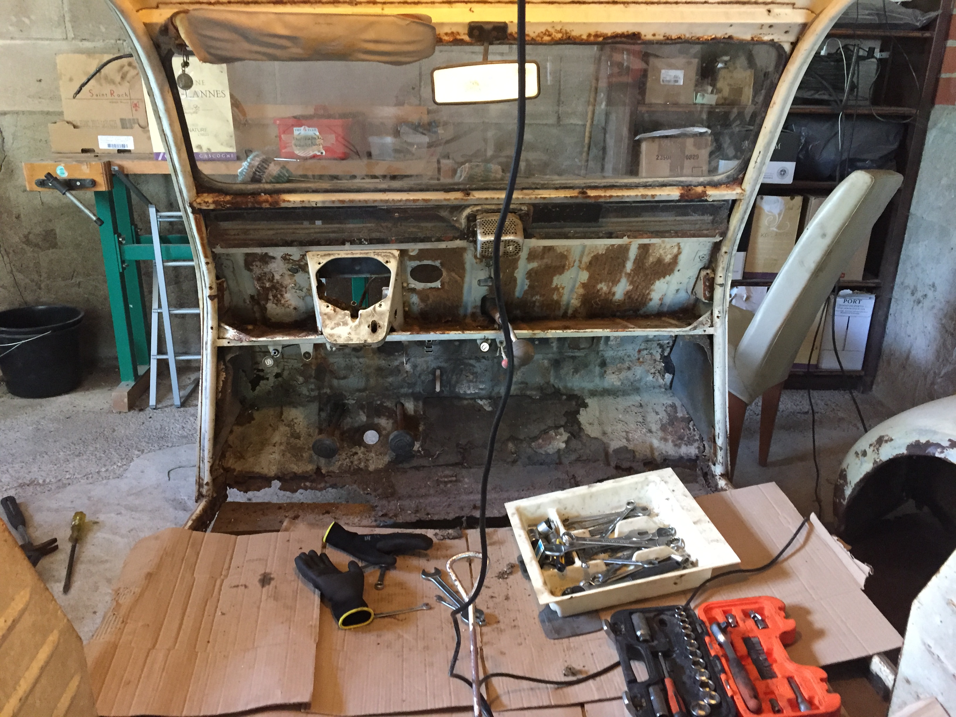 Een dag waar je u tegen zegt. Het begint om 9:00 op de racefiets van Tilburg naar le garage. Daar aangekomen staat Jan van T (weer een andere Jan) al op ons te wachten. We bespreken de mogelijkheden voor het spuitwerk van de carrosserie. Daarna gaan we direct aan de gang. Met een heel nieuw doel: De Carrosserie strippen tot ‘bare metal’!