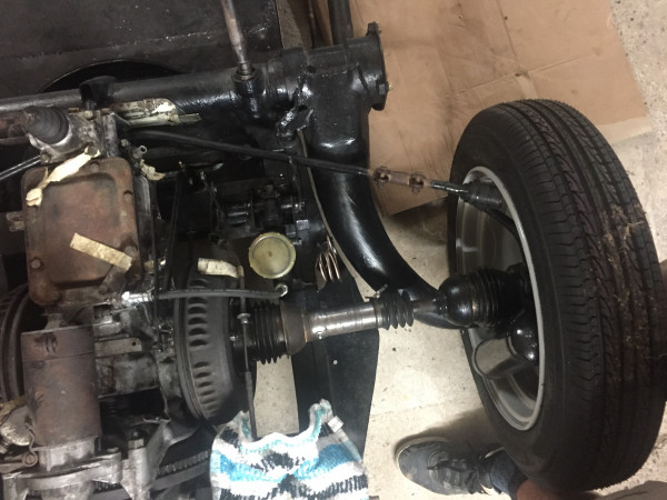Bekomen van de teleurstelling doen we de nieuwe remcilinders weer in de doosjes en retour aan The French Connection. Om te controleren of alle overige onderdelen wél goed zijn, maken we de klus toch maar af. Dat gaat eigenlijk vrij eenvoudig. Zie hier de versnellingsbak weer in elkaar geschroefd. De trommelremmen zijn nu dus bijna-helemaal-vervangen-en-bijna-klaar-voor-gebruik. Nou ja… volgende keer de nieuwe remcilinders erin. Dan kan de versnellingsbak weer terug op het onderstel geplaatst worden! Yeah!